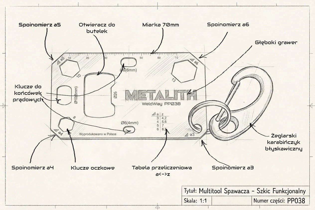 Multitool spawacza - unikalne narzędzie pomocne w codziennej pracy spawacza, nadzoru spawalniczego, mistrzów, brygadzistów. W kształcie Multitoola ukryto szereg funkcji: