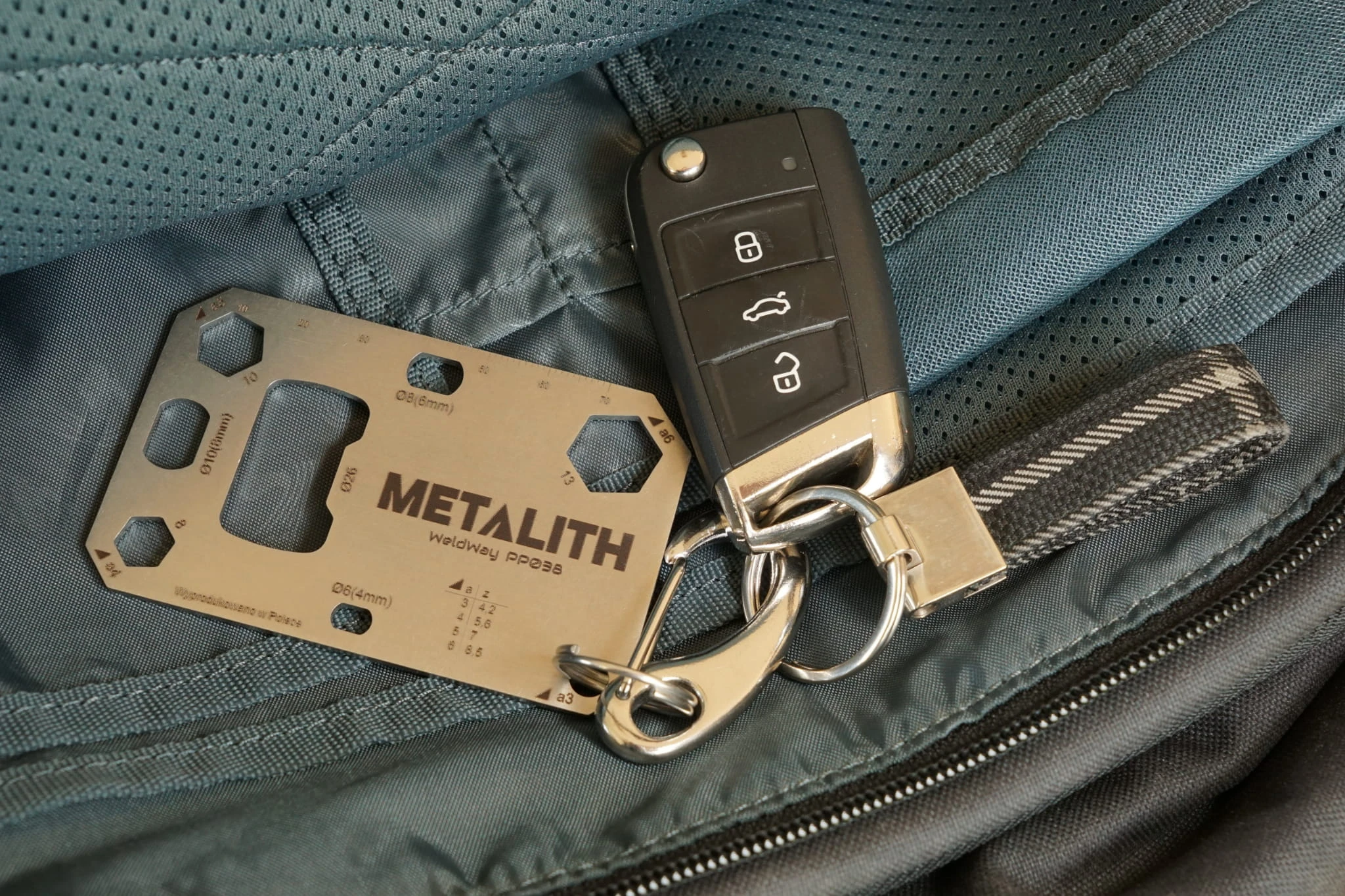 Rozmiar standardowej karty kredytowej pozwala umieścić go w przegródce portfela po odpięciu karabińczyka.
