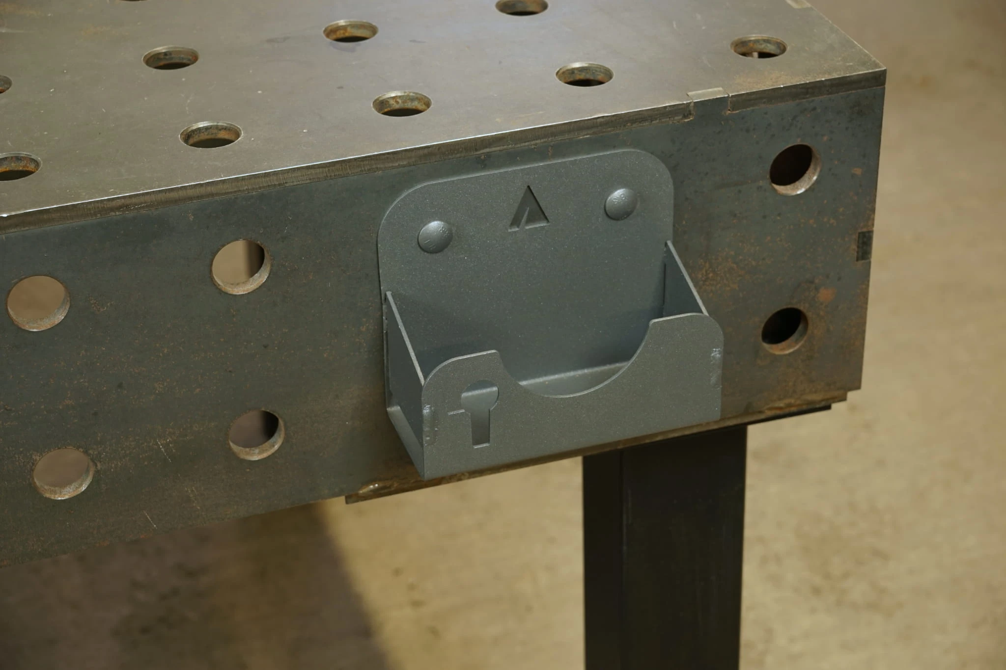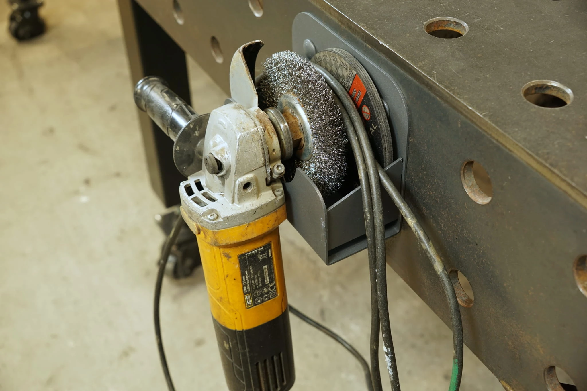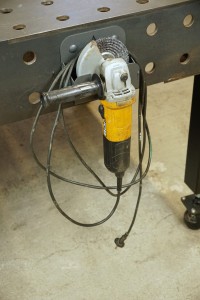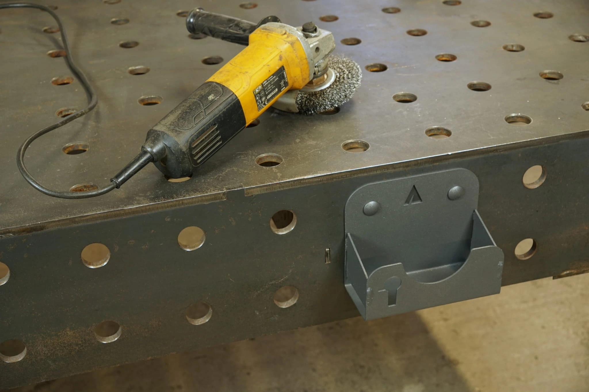 Uchwyt na szlifierkę kątową 125mm przeznaczony do montażu w otworach systemowych stołów spawalniczych. Dzięki niemu zaprowadzisz ład i porządek na stanowisku pracy. Wycięty w elemencie piktogram jednoznacznie wskazuje przeznaczenie uchwytu. Rozmiar uchwytu umożliwia powieszenie szlifierki z zamontowaną tarczą do cięcia, krążkiem z fibrą, ale też szczotką drucianą boczną lub czołową. Ponadto w uchwycie można przechowywać tarcze szlifierskie, klucz do szlifierki, a specjalna konstrukcja umożliwia zawieszenie przewodu szlifierki. Wiele funkcji zostało zintegrowanych w jednym wieszaku! Konstrukcja uchwytu została wzmocniona spawanymi żebrami, dla maksymalnej trwałości, wytrzymałości na uderzenia i w celu eliminacji deformacji w czasie od ciężaru szlifierki. Jest to prawdziwe narzędzie do zastosowań przemysłowych!