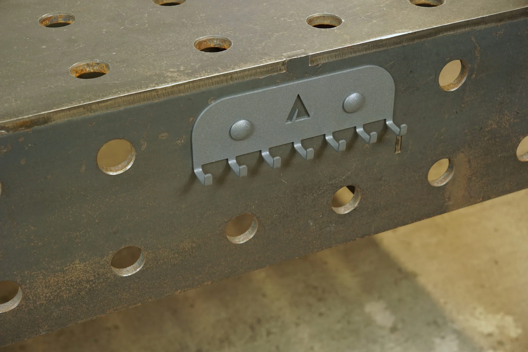 Kompatybilność: Stoły spawalnicze z siatką otworów co 100mm i grubości ścianki od 8mm do 25mm. Średnice otworów Ø28 i Ø16mm. Montaż na pionowej ścianie stołu, zalecana wysokość ściany bocznej 200mm. Montaż na ścianie bocznej 100mm również jest możliwy.
