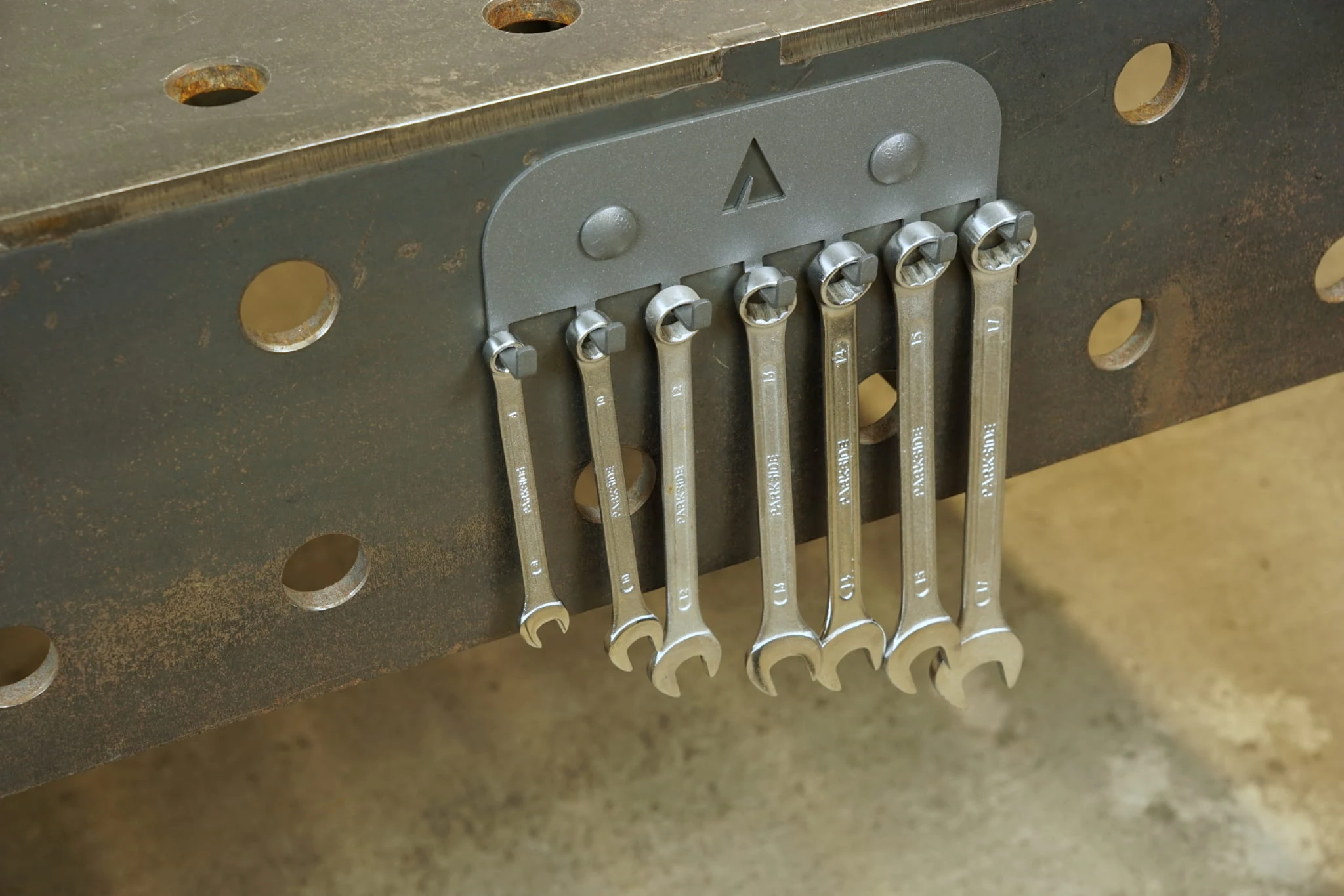 Standardowo w zestawie dostarczony jest komplet 1011201 umożliwiający montaż w otworach systemowych stołów spawalniczych.