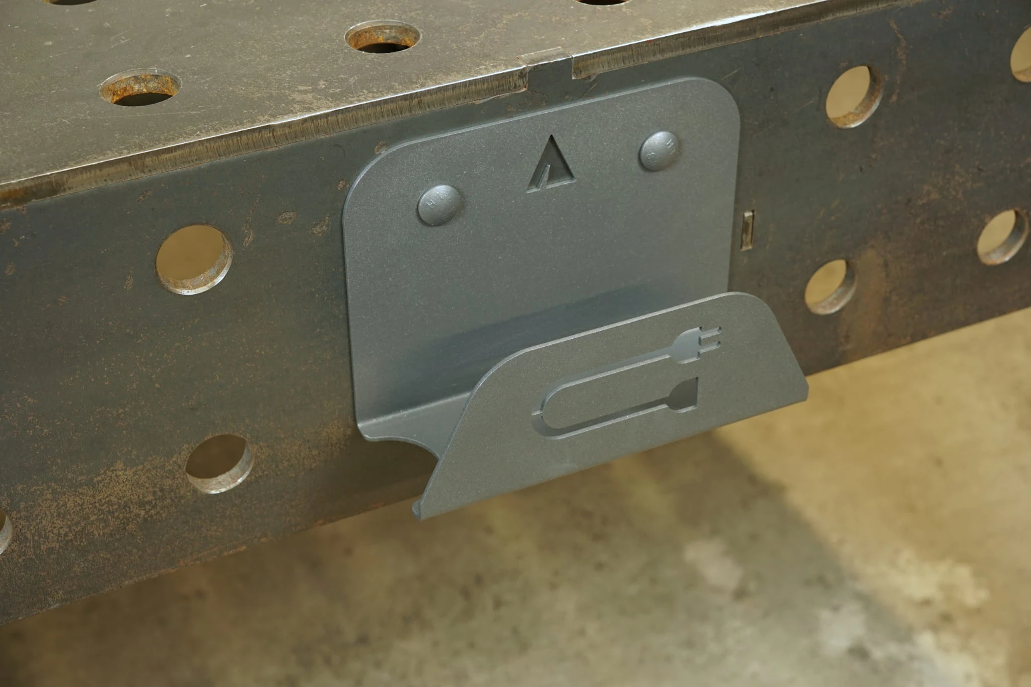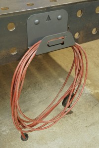 Wieszak na przedłużacz przeznaczony do montażu w otworach systemowych stołów spawalniczych. Dzięki niemu zaprowadzisz ład i porządek na stanowisku pracy. Wycięty w elemencie piktogram jednoznacznie wskazuje przeznaczenie wieszaka. Standardowo w zestawie dostarczony jest zestaw montażowy 1011201 umożliwiający montaż w otworach systemowych stołów spawalniczych.